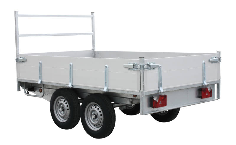 | Binnenafmeting L*B*H (mm) | Boutenafmeting L*B*H (mm) | Assen ongeremd | Hoogst toegelaten gewicht HTG (kg) | Toegelaten laad- vermogen (Kg) | Tarra (kg) | Banden |